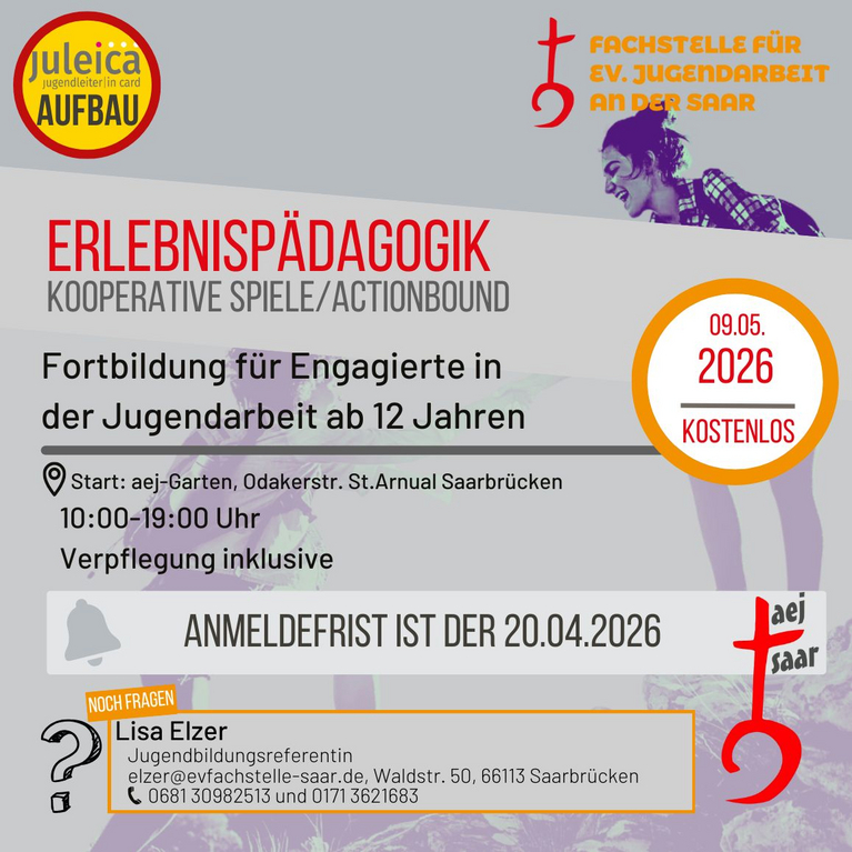 In diesem Juleica Aufbaukurs kann ein Einblick in die Möglichkeiten der Erlebnispädagogik mit Gruppen gewonnen werden, bezogen auf das Medium der kooperativen Übungen und der digitalen Schnitzeljagd Actionbound. Es verknüpft Theorie und Praxis im Erfahrungsraum Stadt und Wald. Der Fokus soll auf einem eher geringen Materialaufwand liegen, damit auch für jüngere ehrenamtliche Helfer die Möglichkeit besteht, das Erfahrene gut umsetzen zu können.
